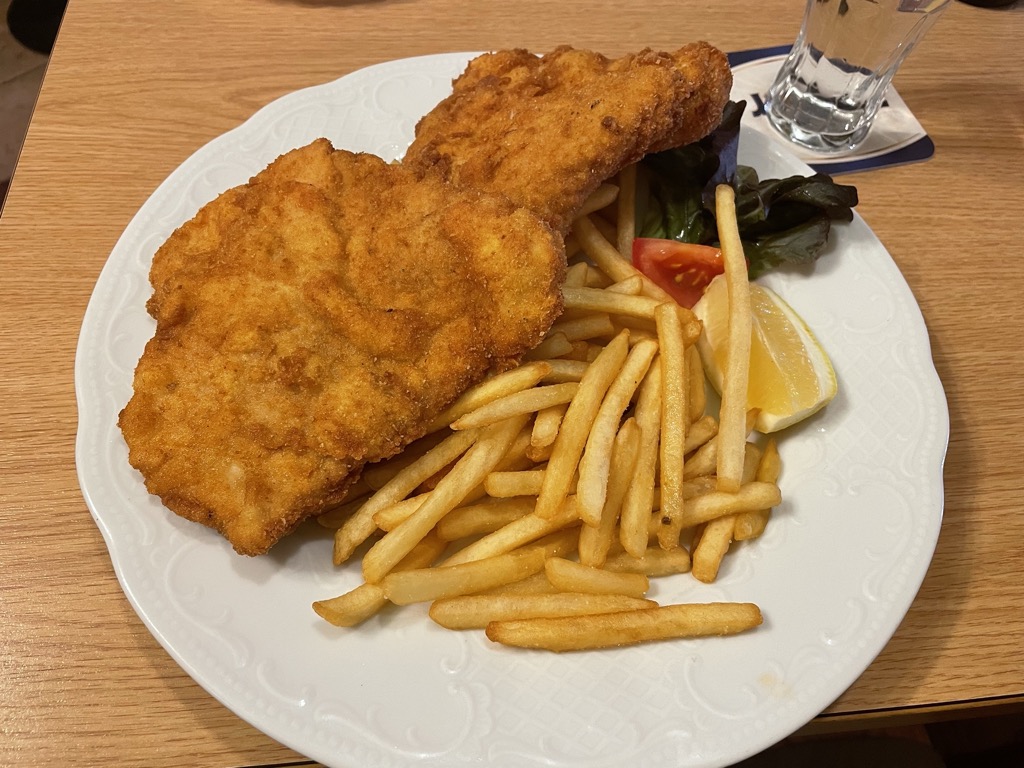 Now that the restaurant/beer garden was open there, was about 18:30 by then, I was able to order my food. I had decided I was going to have a Wiener schnitzel and chips for dinner. Was glad I did, it was massive !! I really enjoyed it. Had my beer when I got back to my room.