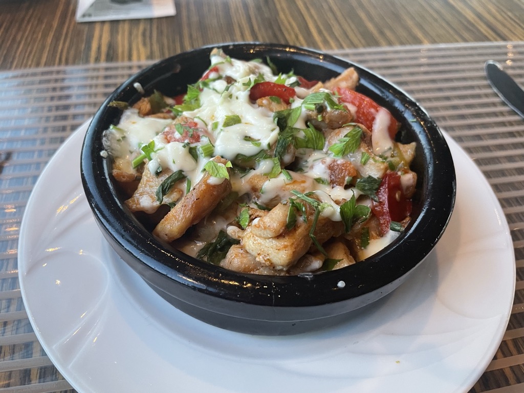 I was pretty knackered so didn't want to hassle or venture too far for dinner, so just had something at the hotel. which was tasty enough. Had the "Chicken Casserole with Cheddar Cheese Sautéed chicken thigh tomato with green pepper, onion mushrooms and cheddar cheese." They brought bread too. I had already had a few snacks while out and about so was sufficient.