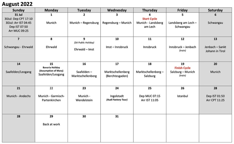 I had decided that I'd start the cycle near the end of the 1st week in Germany. I also had the idea to visit Edmund in Regensburg who I had met at various TTP conferences in the past, so that filled the gap in the 1st week. After the cycle I didn't have any specific plans but that got padded out with things over time.